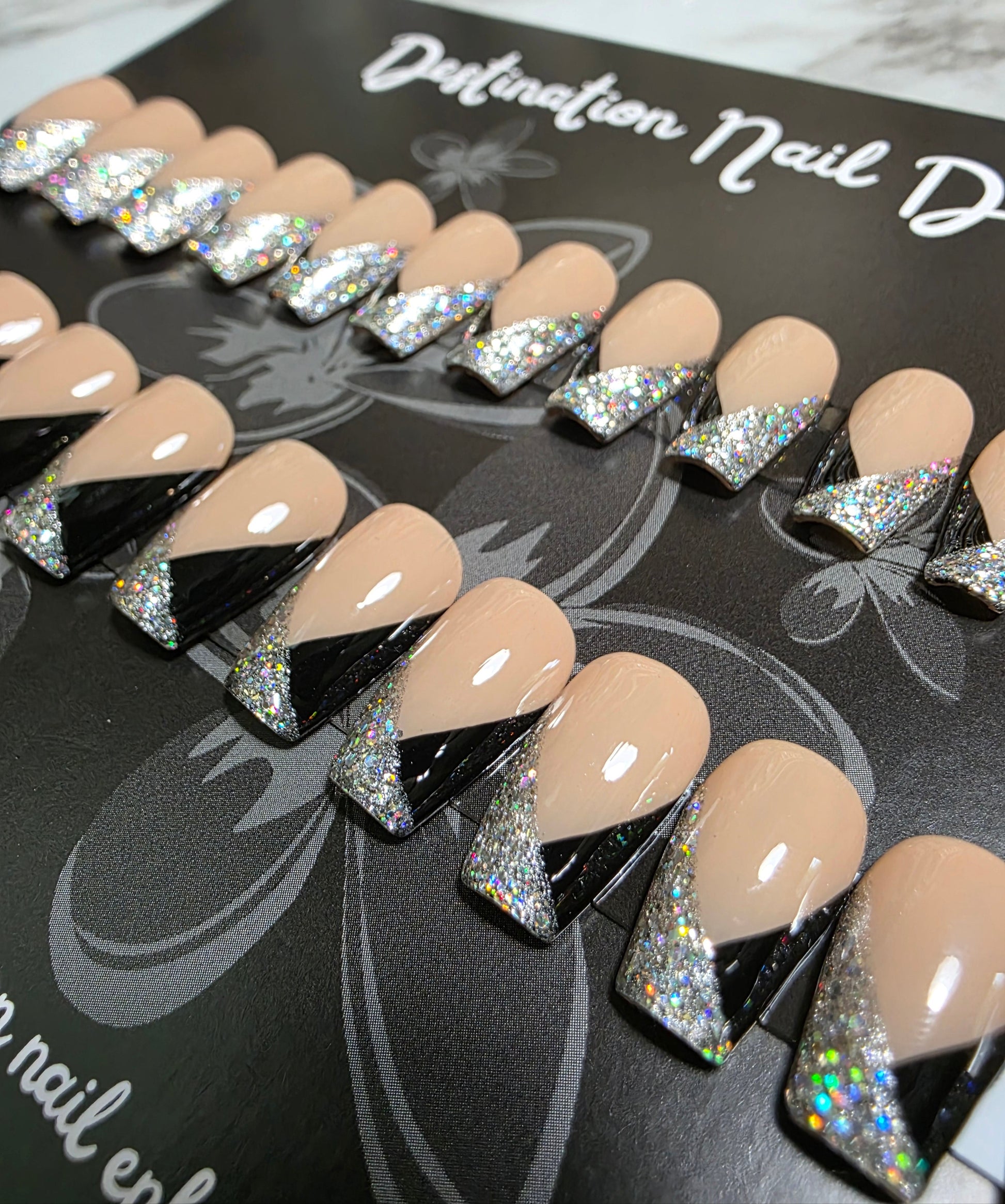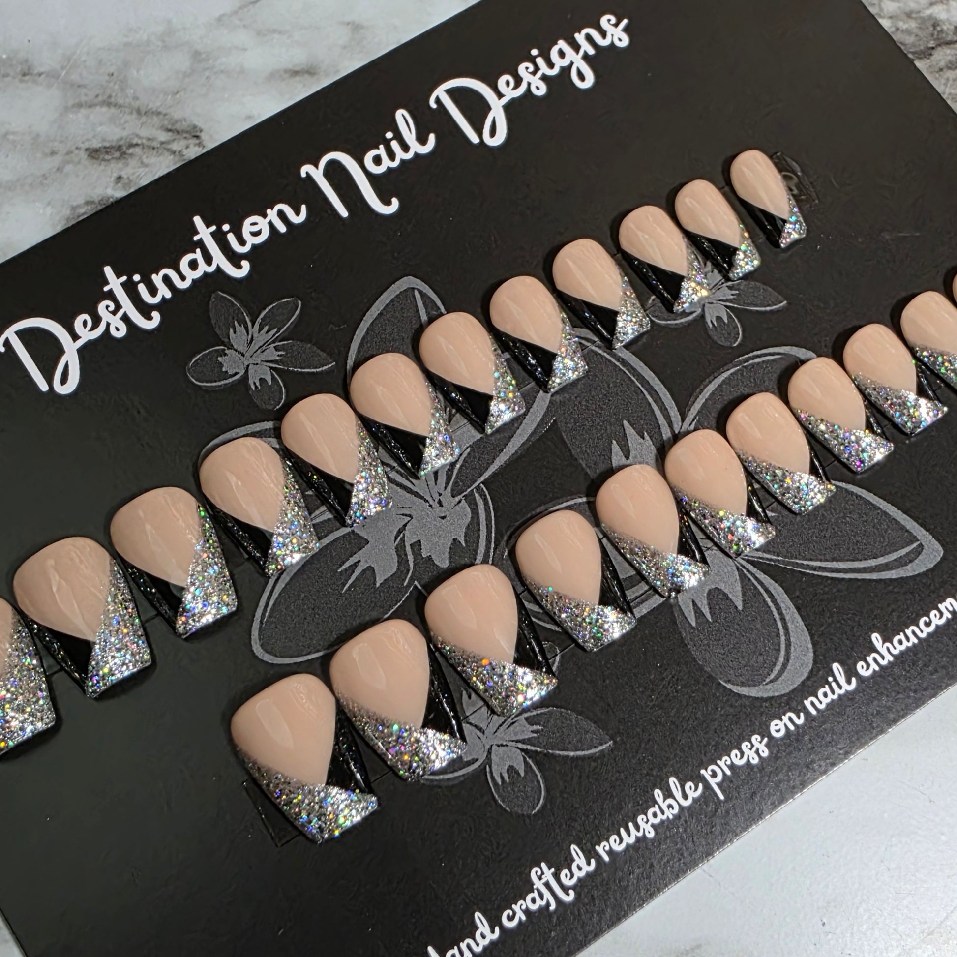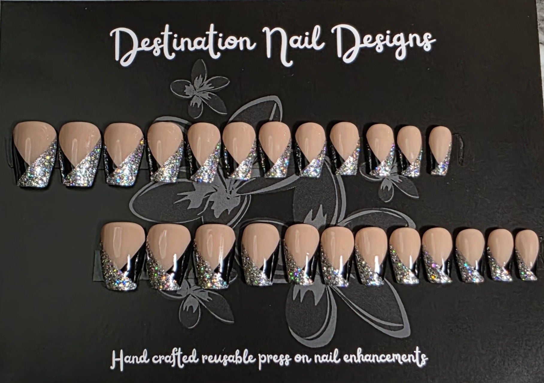 This set is very classy with a little sparkle. If you like this look, but only want to order 10 nails, just place a custom order!