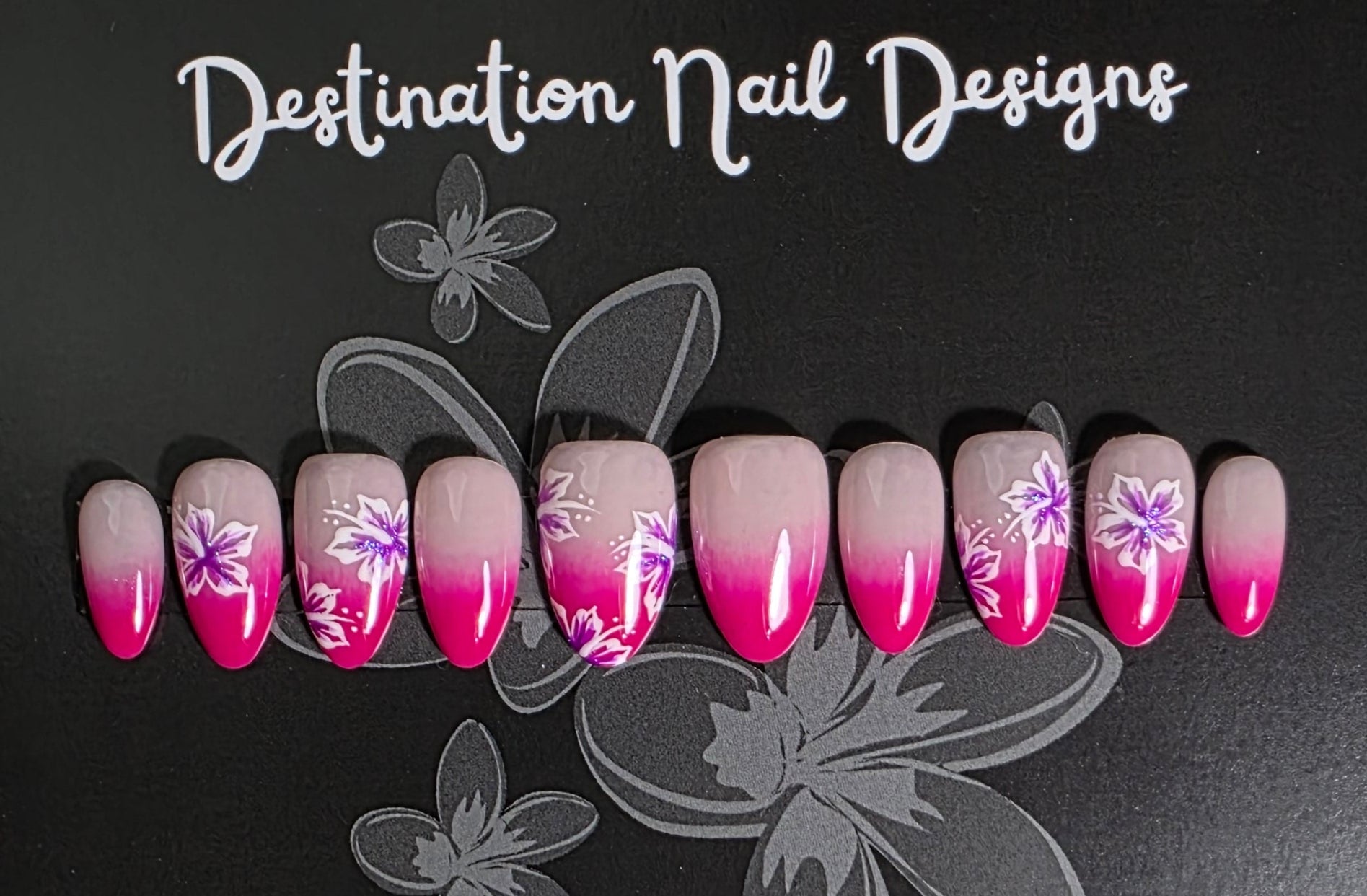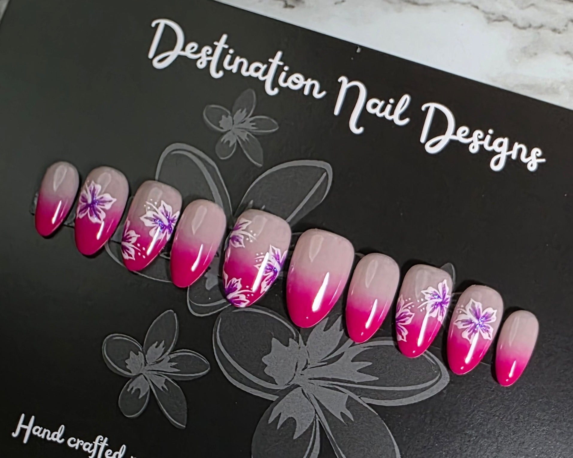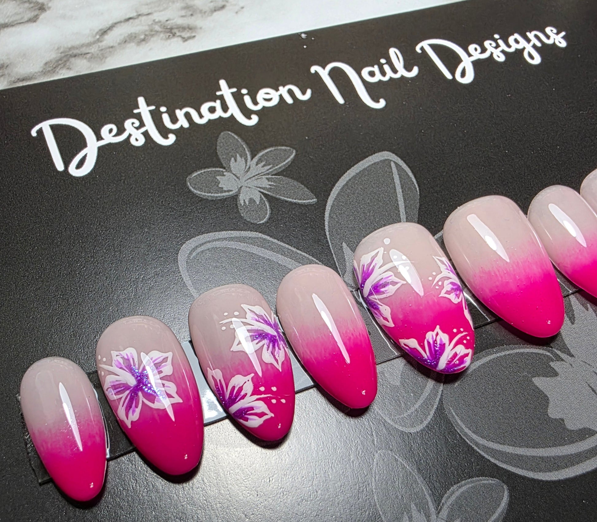 A classic nude ombre'd with a summer shade of magenta with white and purple hibiscus flowers.
