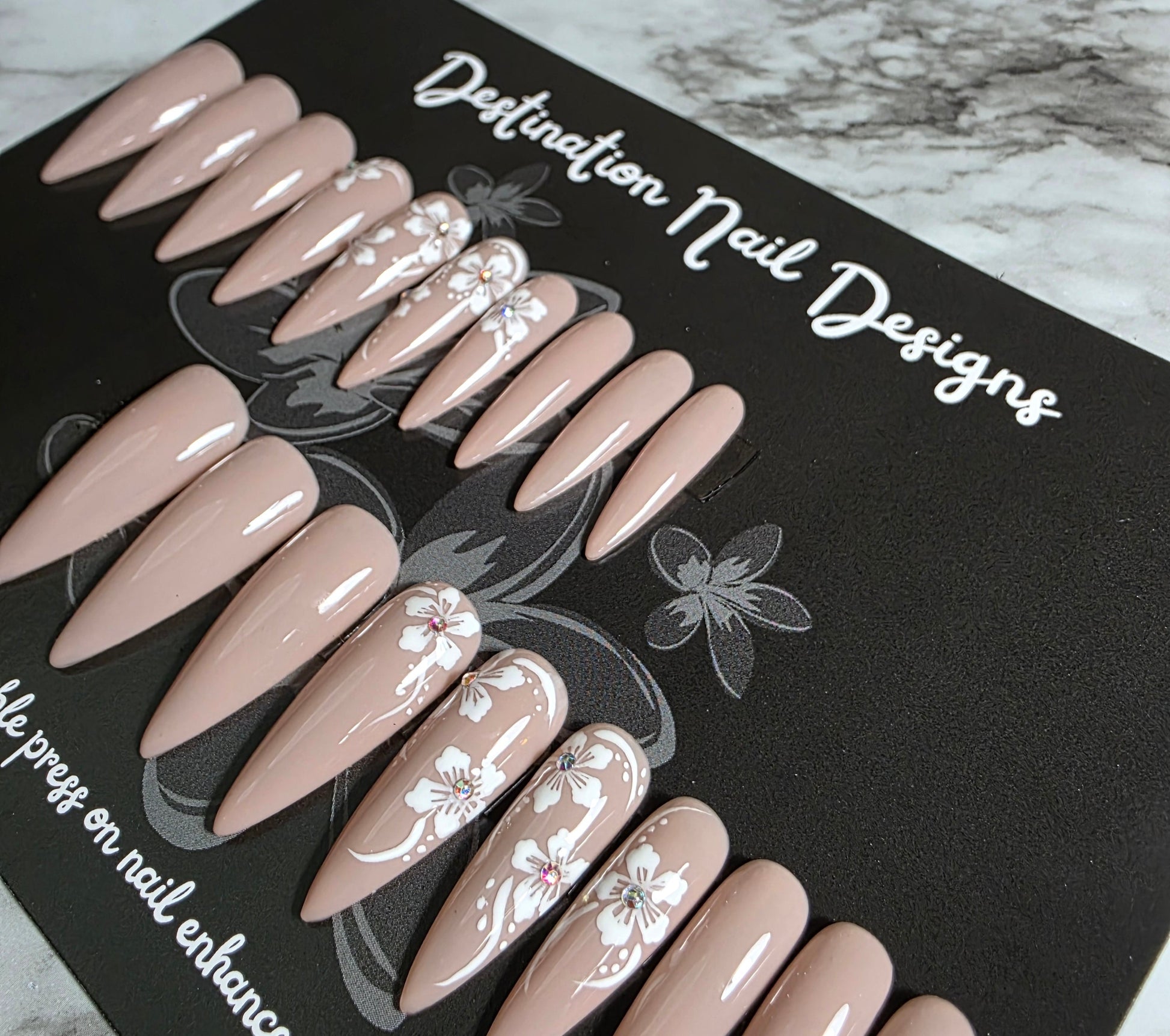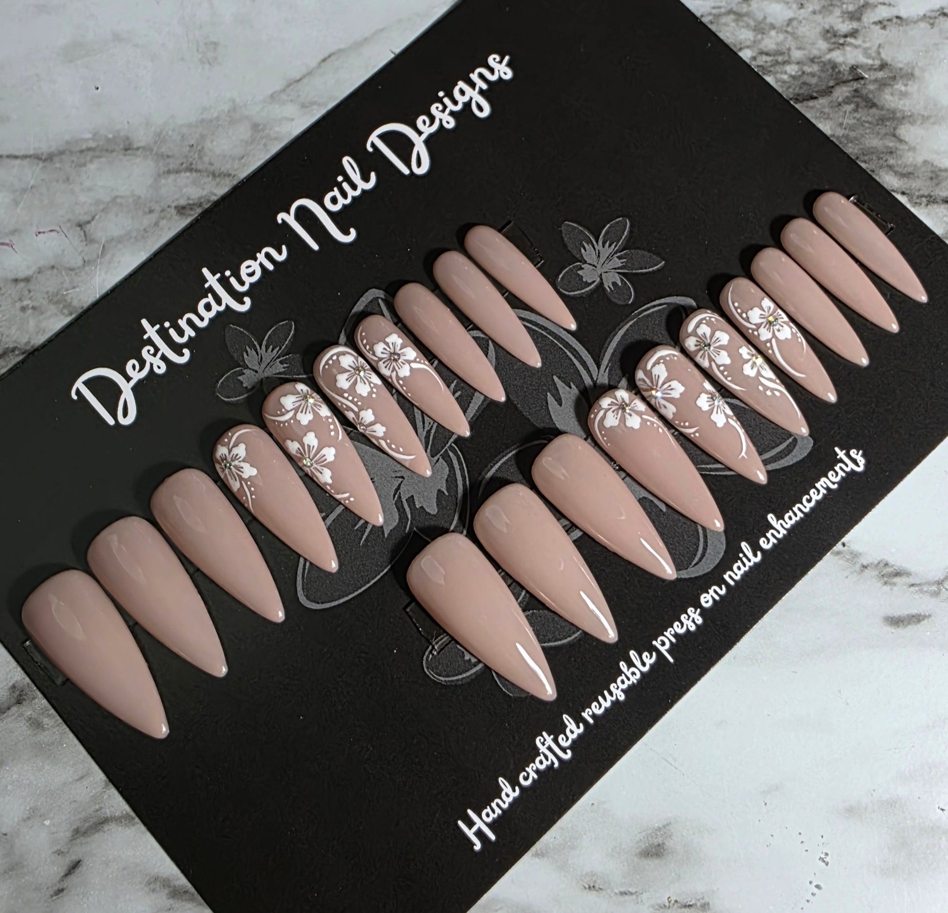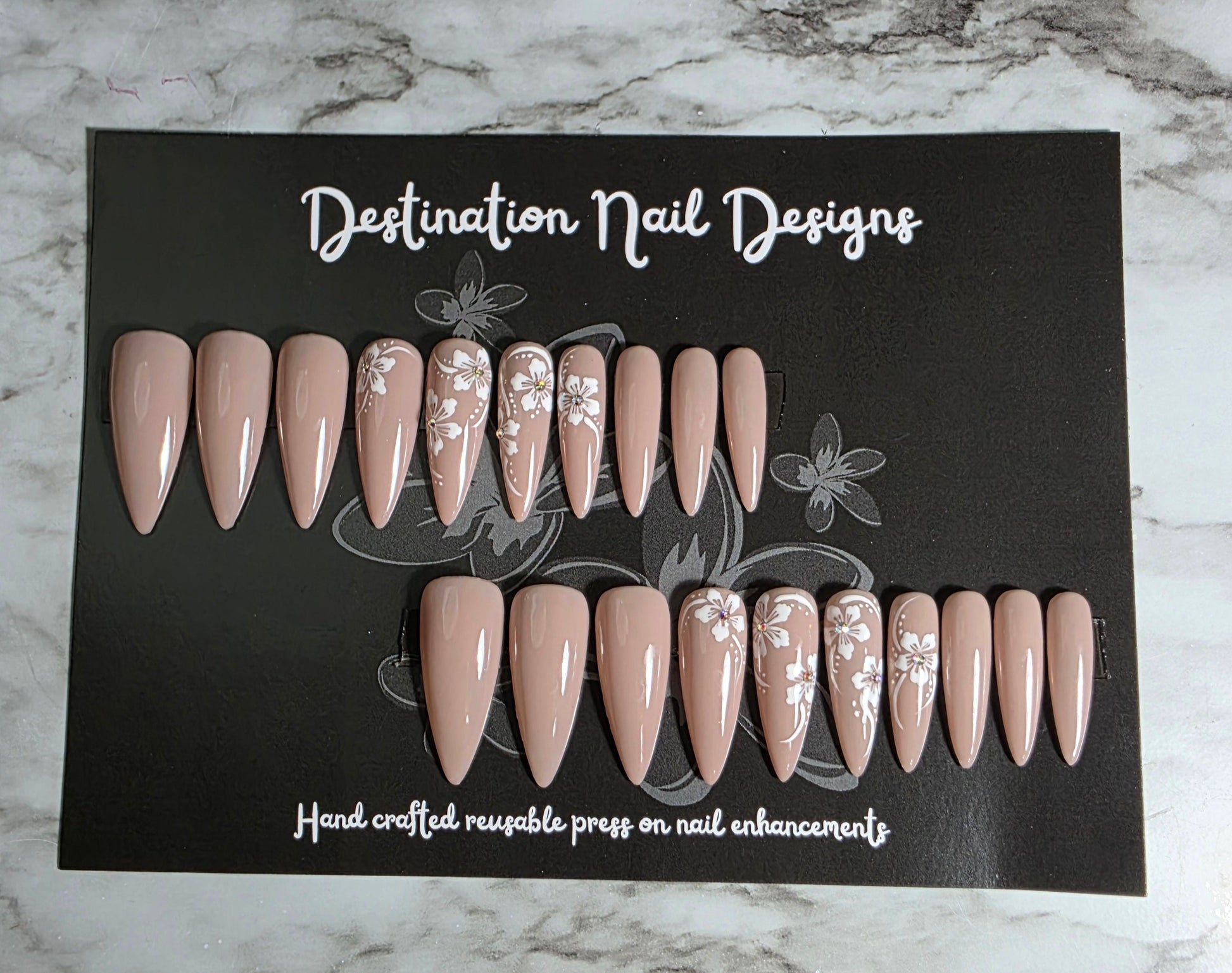 A flattering shade of nude with elegant hand painted flower detail (and a few gems) on this stunning set. This set would be beautiful in a short length too!