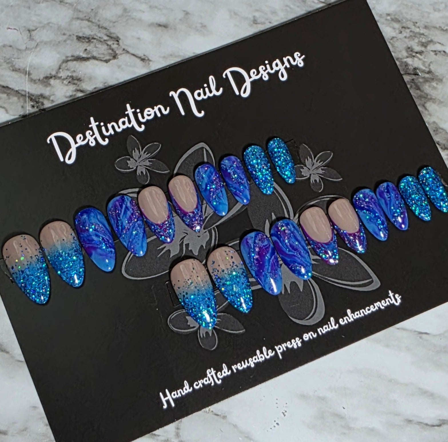 Choose Custom Order deposit and add "Blurple Giltter" to cart notes if you want this look in a different sizing, length, shape or color! We will connect before your order is created! Final price varies based on your approved design choices.