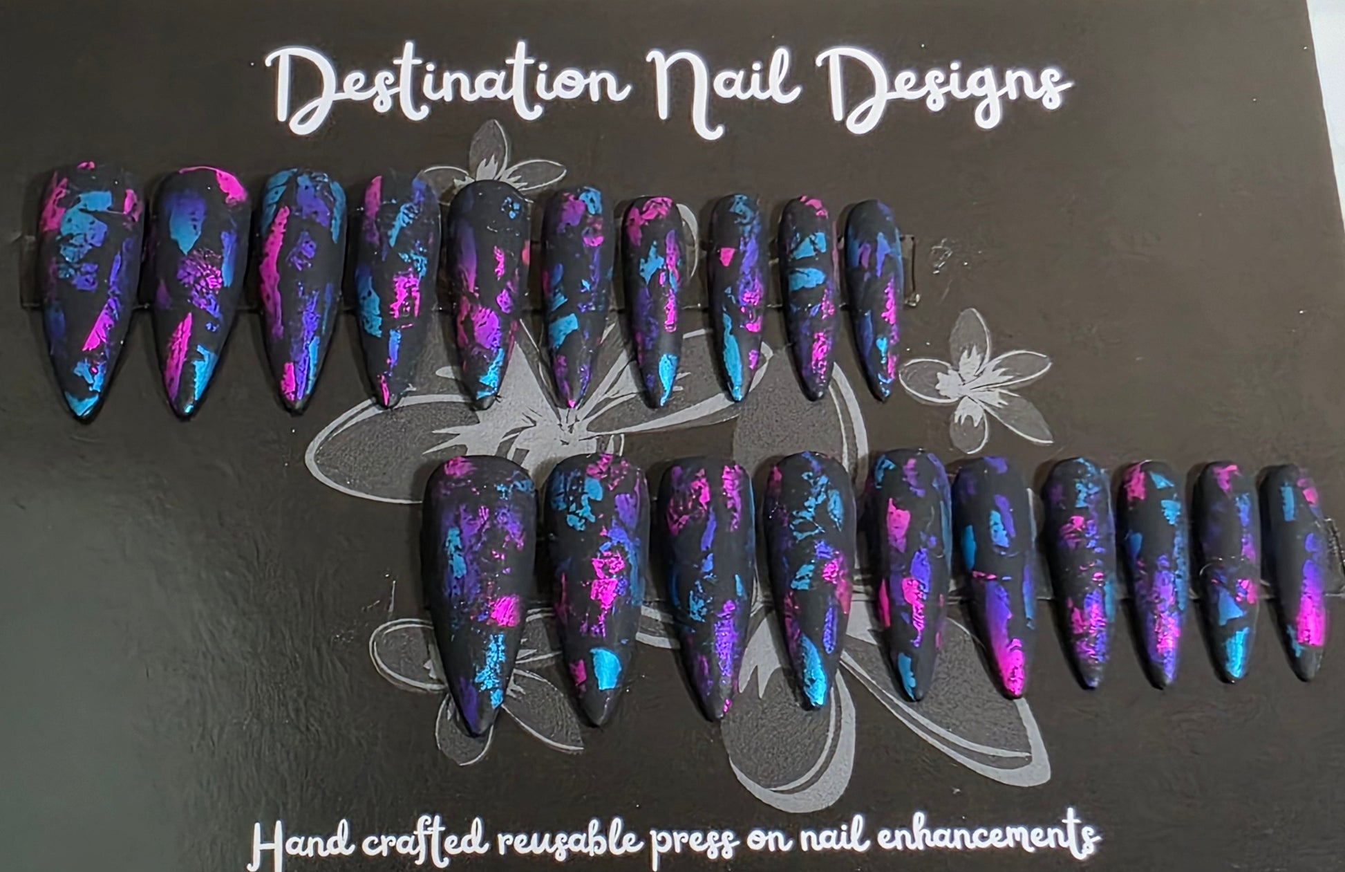 This set is fun and funky! A black background with purple, teal and magenta foil highlights, sealed in a matte top coat!. Fully customizable look!