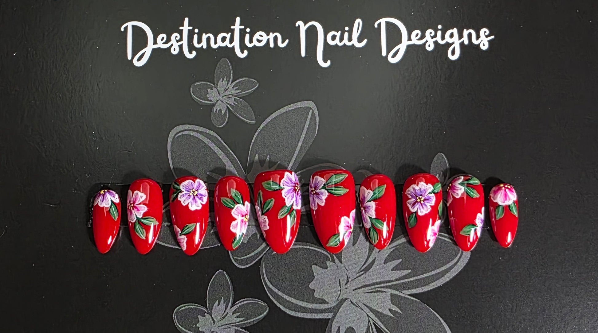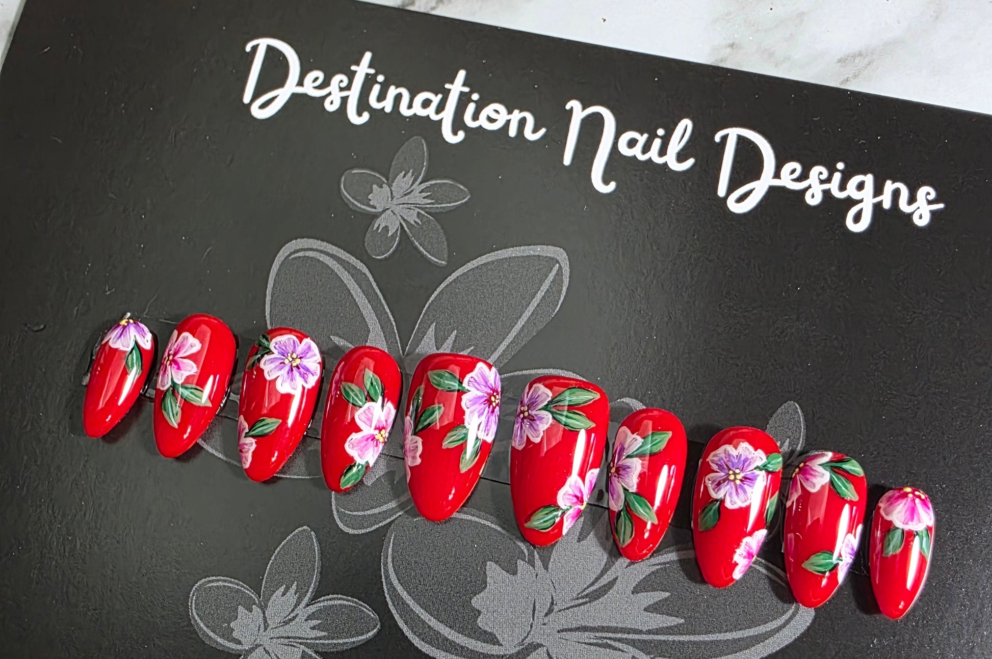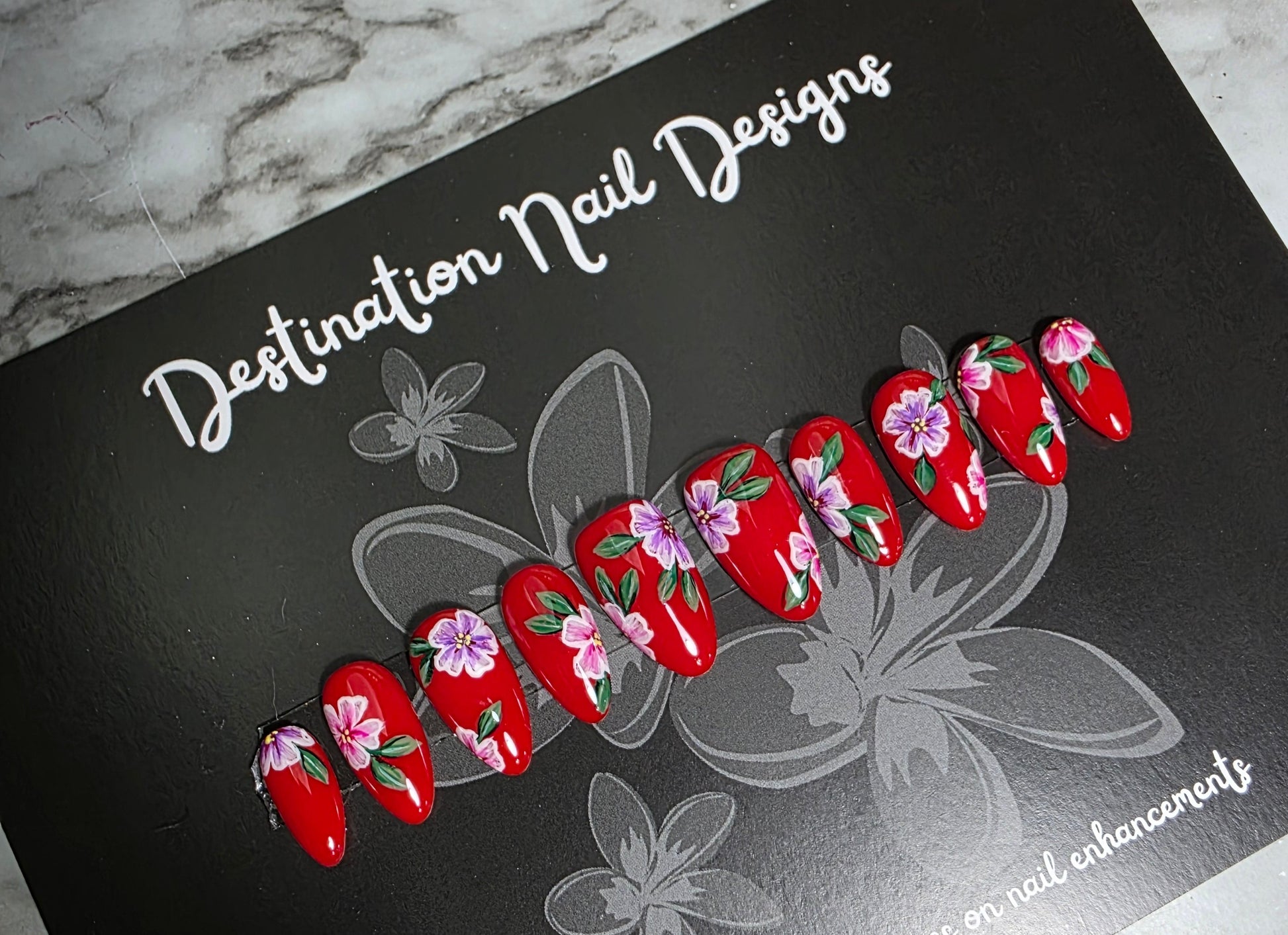 Choose Custom Order deposit and add "Oriental Flowers" to cart notes if you want this look in a different sizing, length, shape or color! We will connect before your order is created so we can pick your perfect shade!