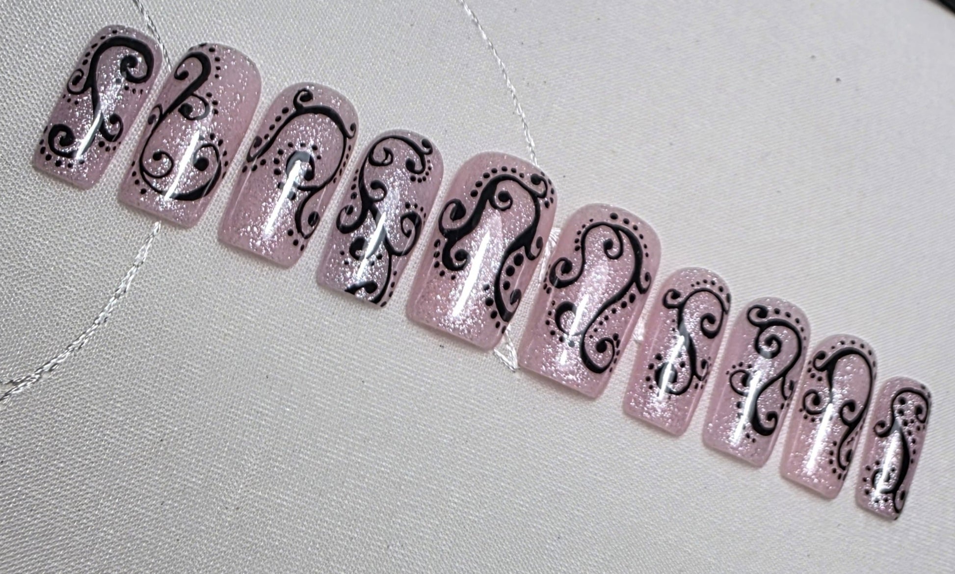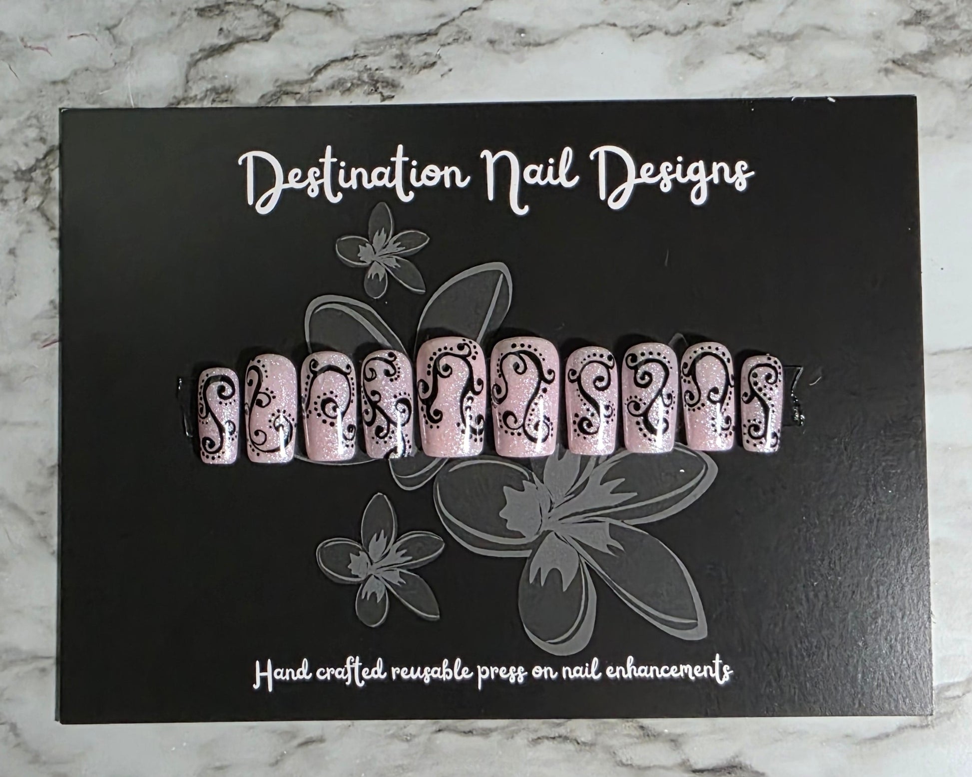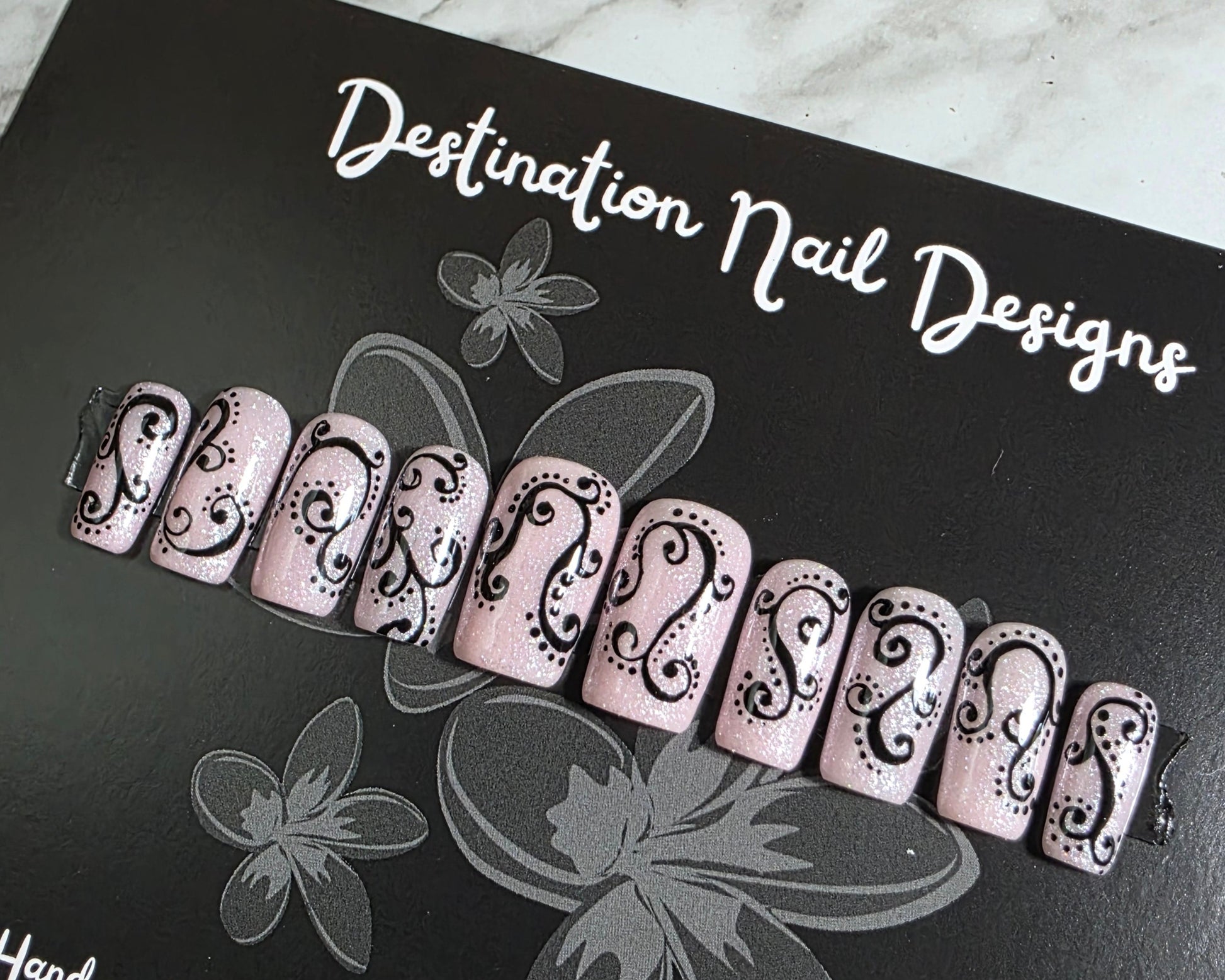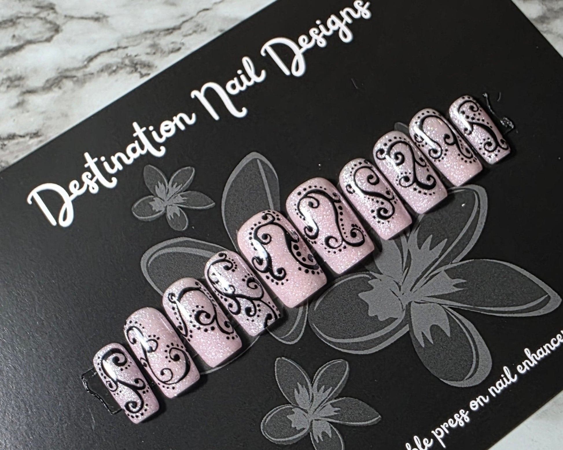 Light pink glitter base with intricate swirls, topped with a shiny gloss top coat.