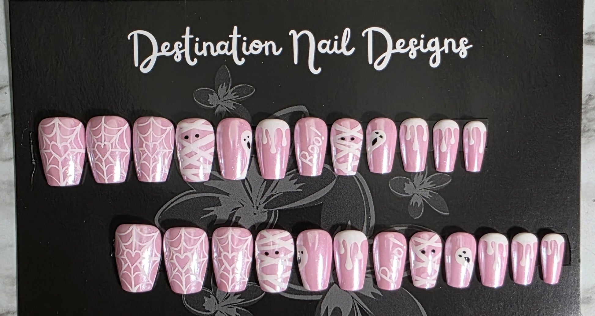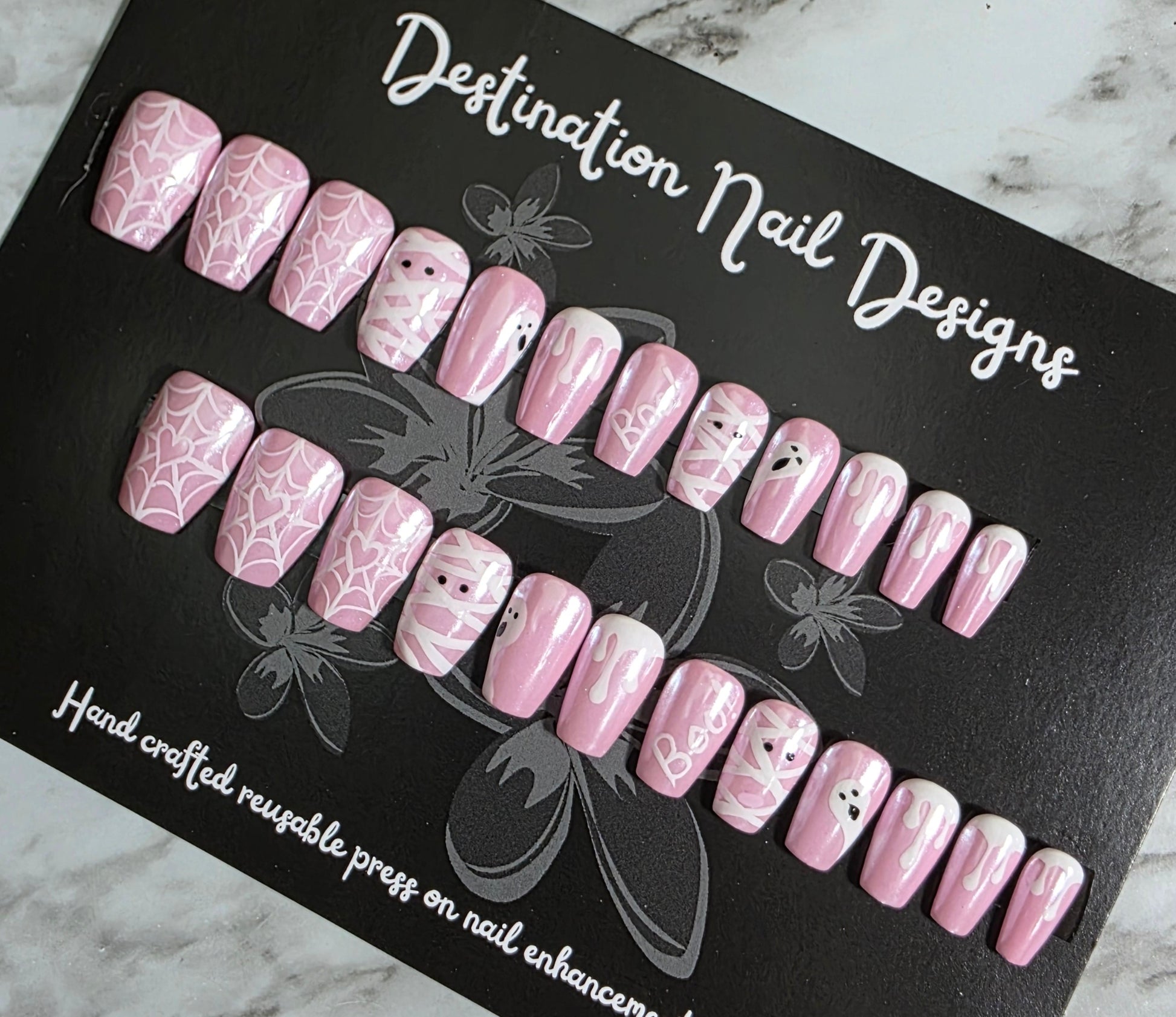 Ready for spooky season! A pearl pink with white accents. Perfect to be spooky and light and breezy too.