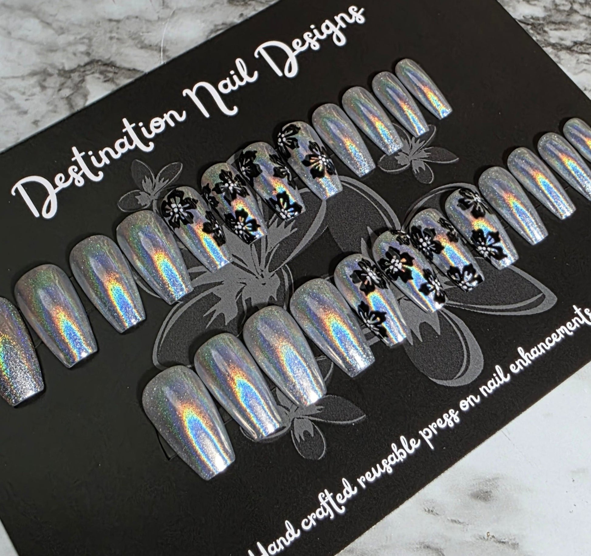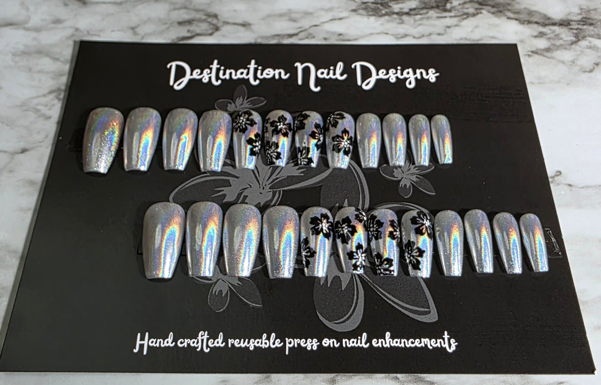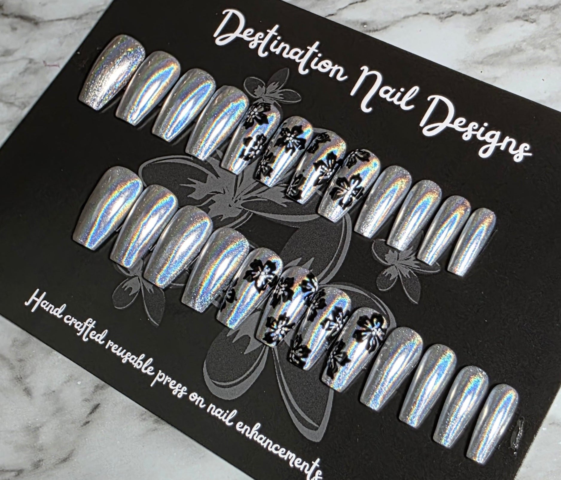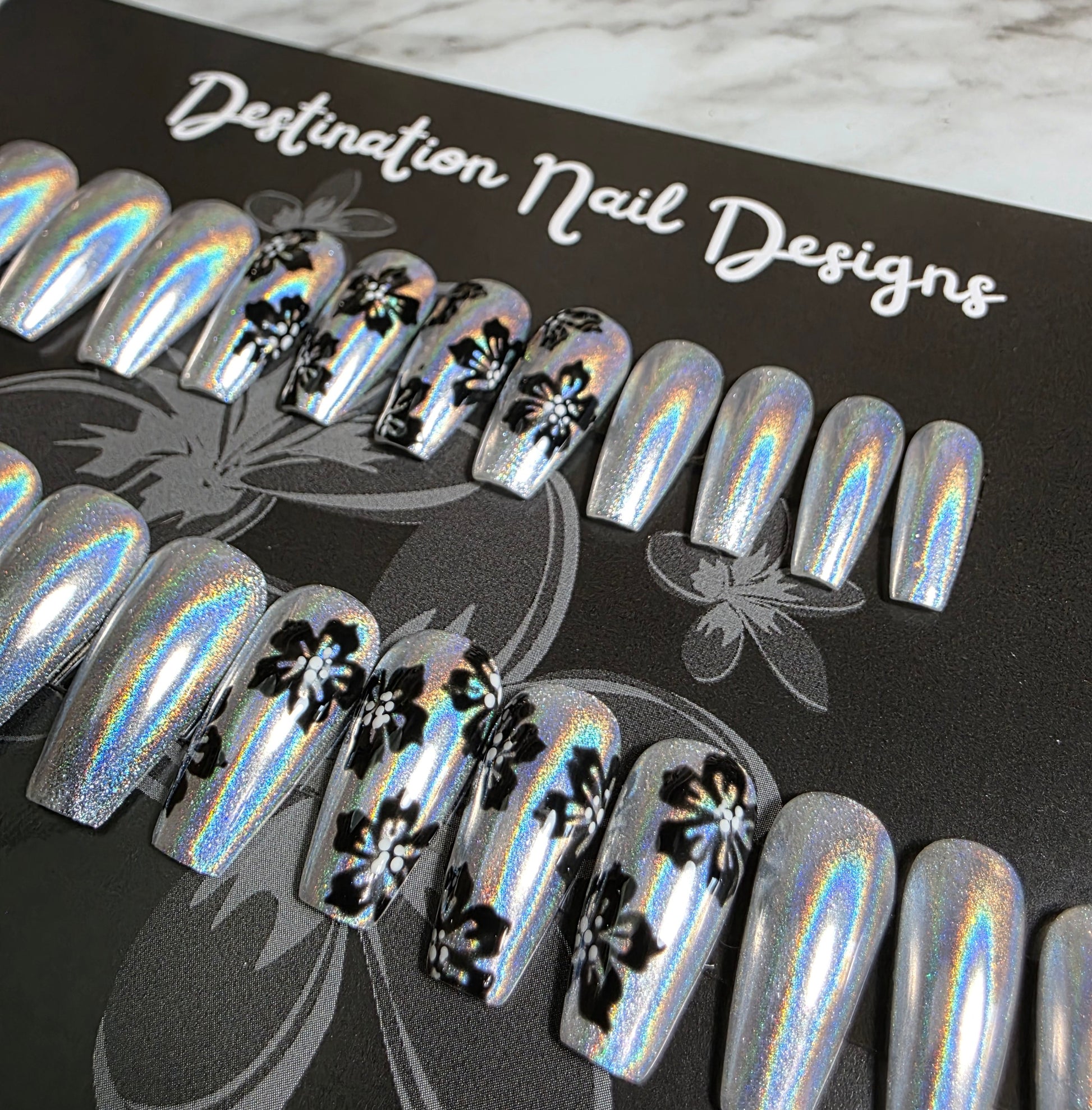 Silver Holographic base with black flowers. No gems here, all the sparkle is encased is a super glossy top coat! Like the look, but not the length? We can customize to your specs!