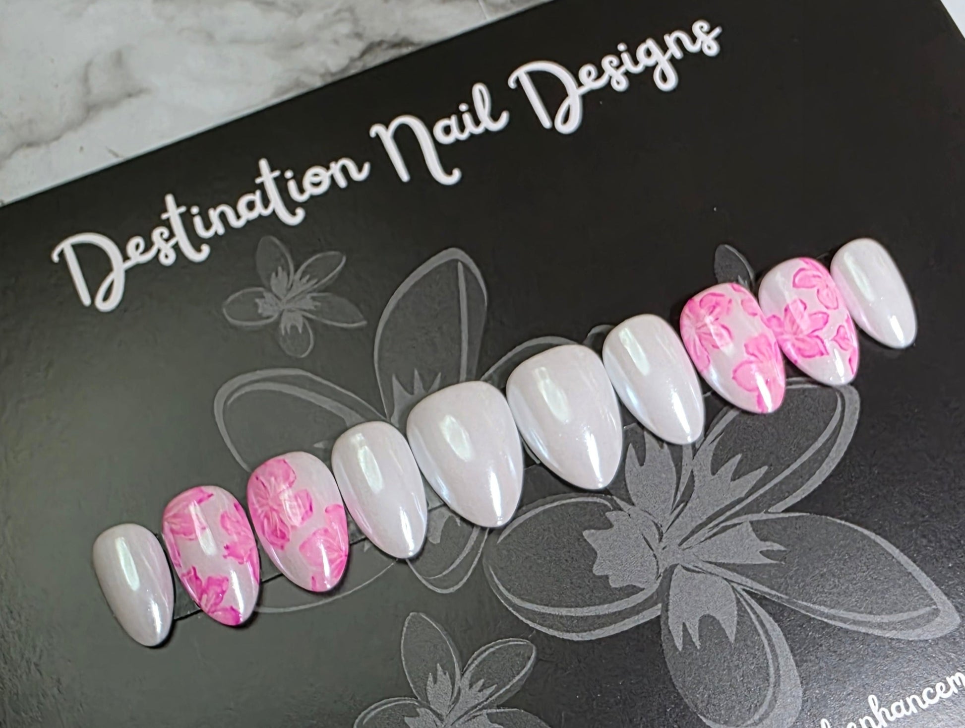 Feminine and sleek! Hand designed alcohol ink painted flowers with pearl chrome detail give your classy manicure some personal style.