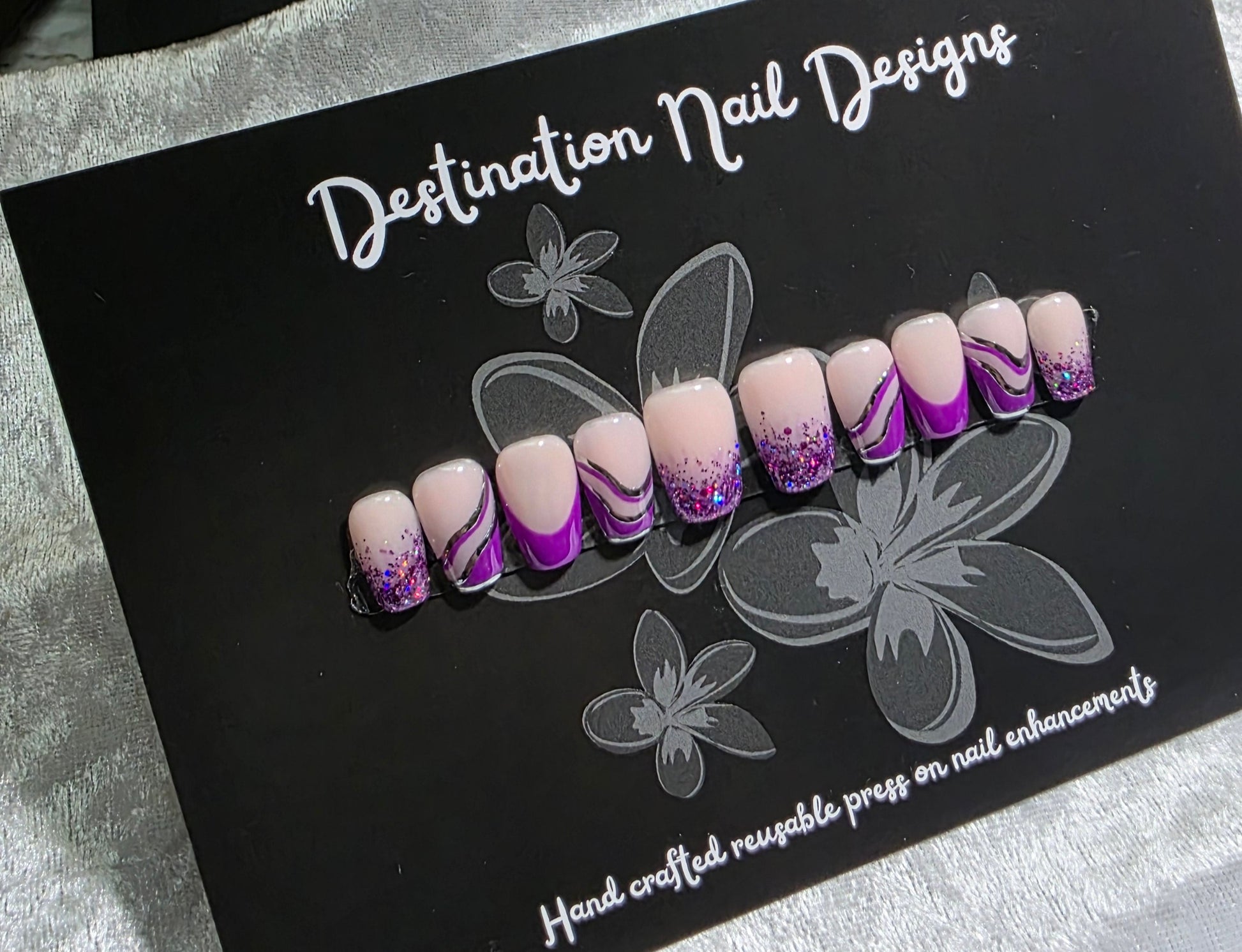 This is a flattering nude base, with purple and silver highlights. A fun twist on a boring french!